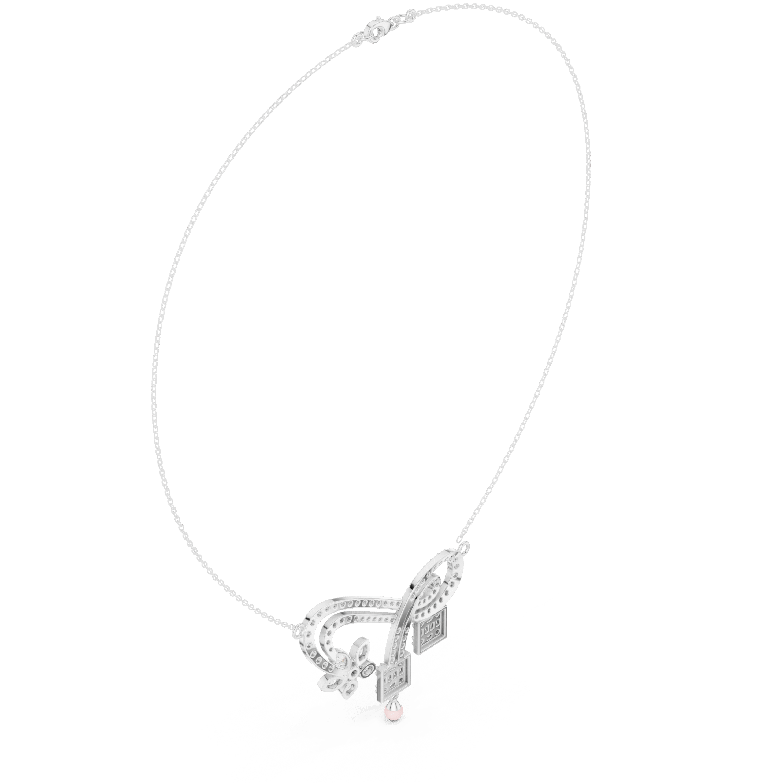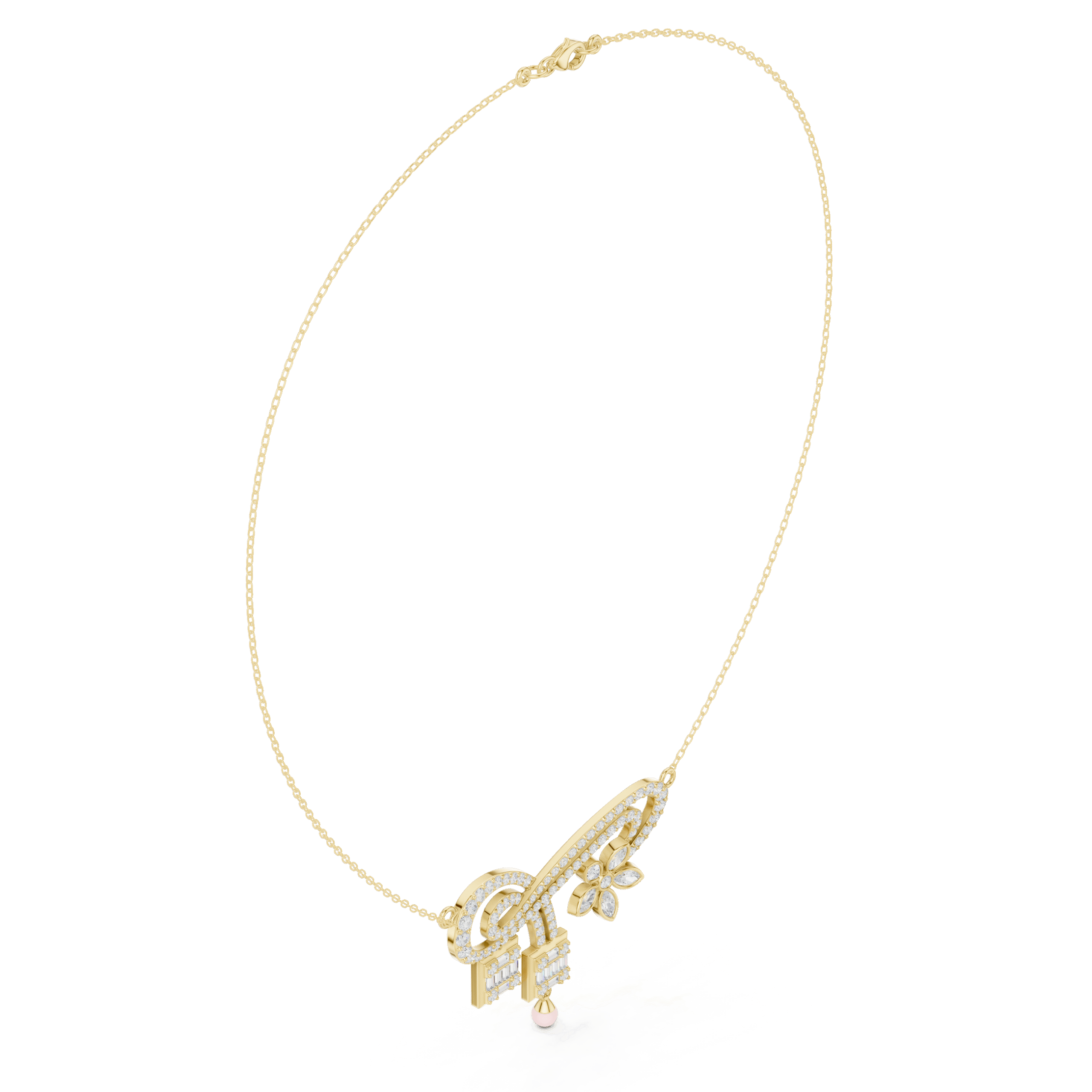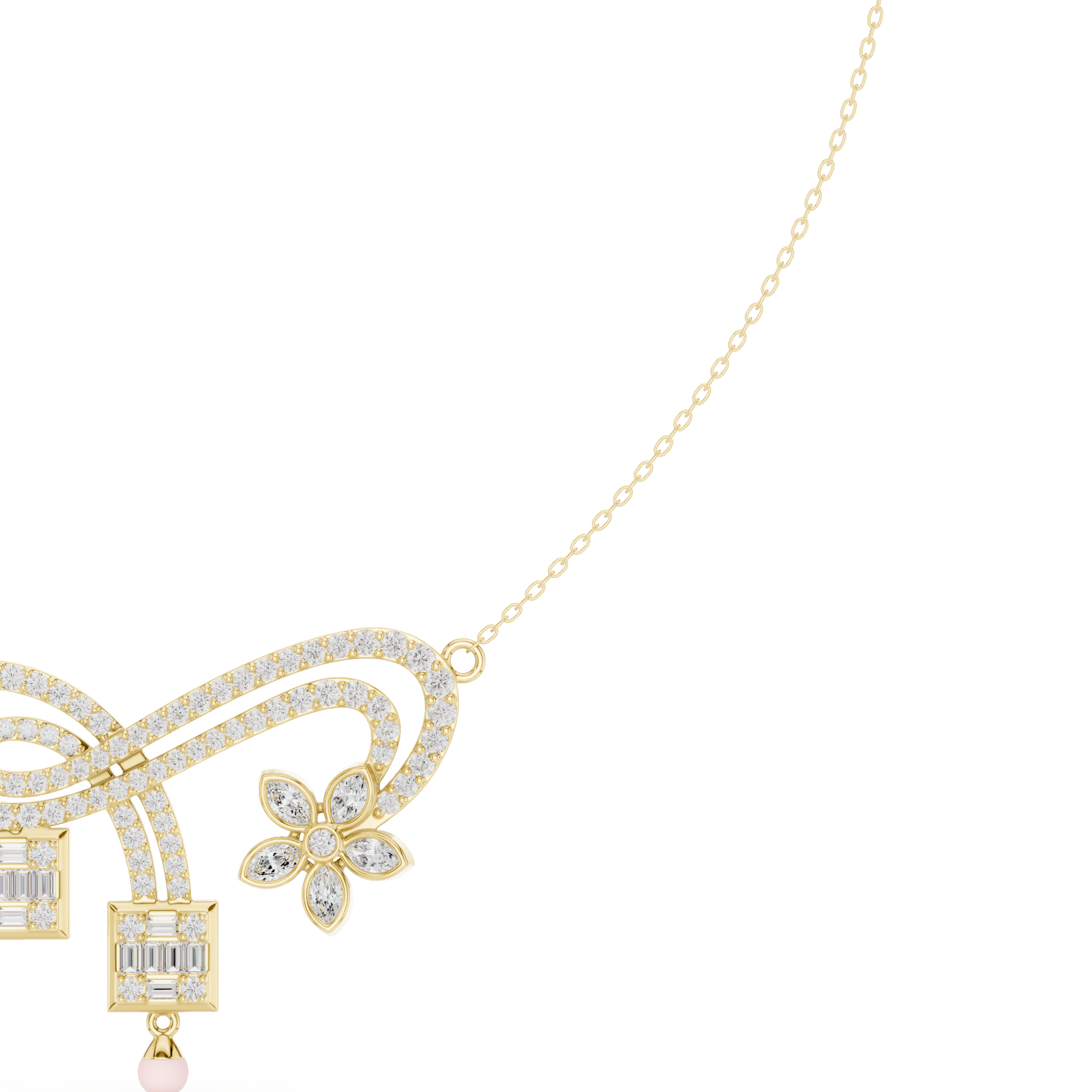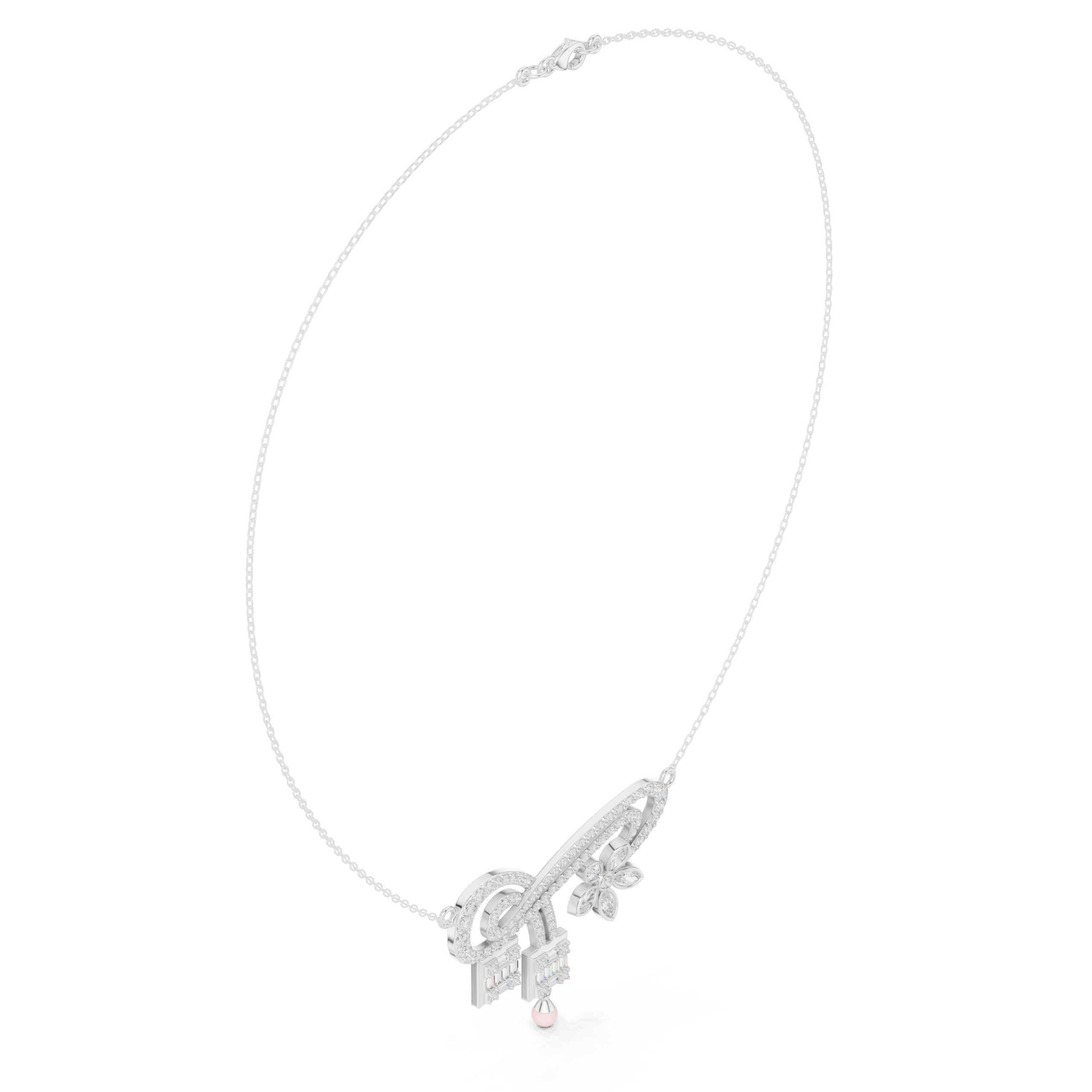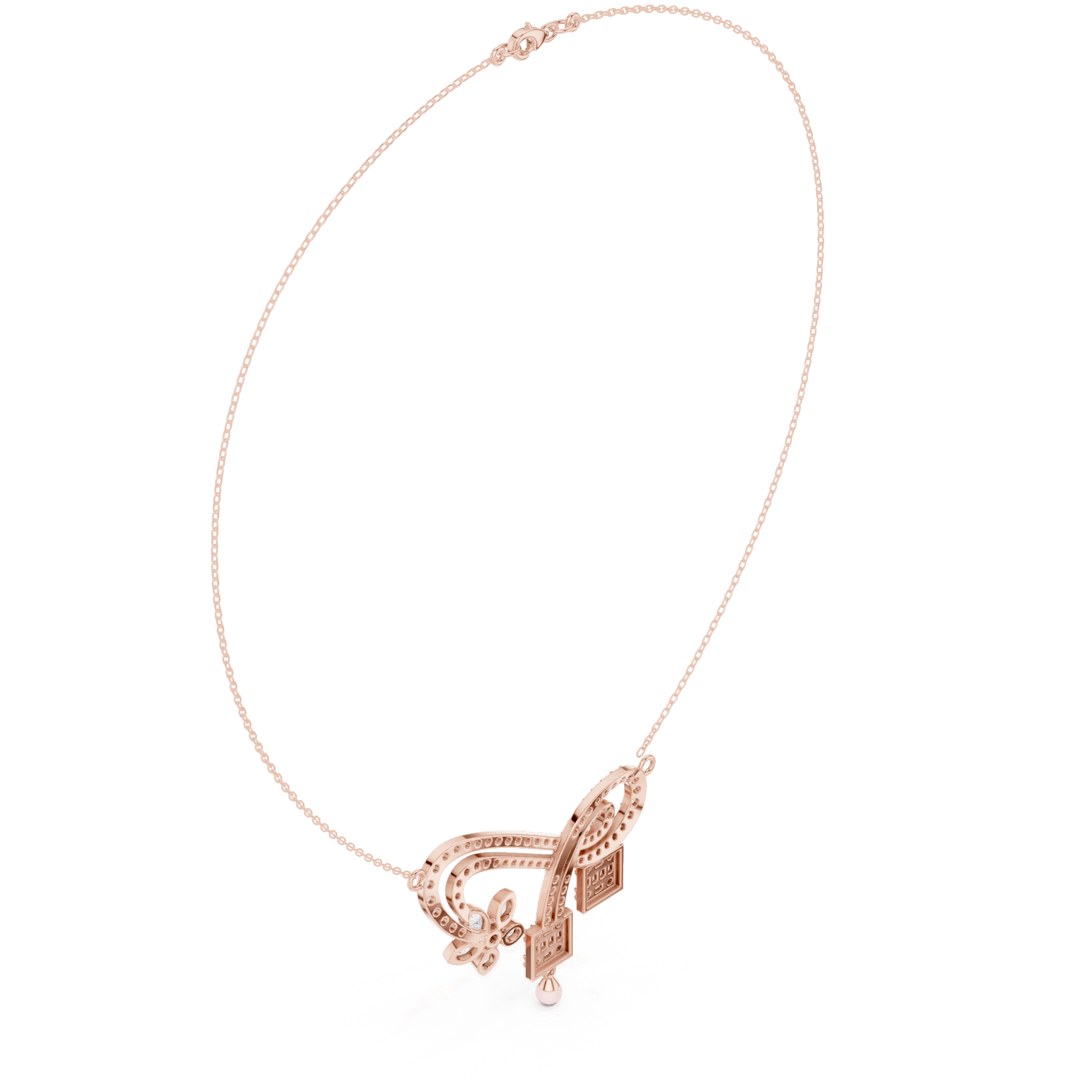 This Enchanted Garden Ribbon Lab-Grown Diamond Necklace features a fluid, pavé-set ribbon motif that curves gracefully into a romantic five-petal floral accent. Two architectural drops featuring baguette-cut diamond clusters extend from the center, creating a sophisticated geometric contrast to the organic, swirling lines of the rose gold frame. Perfectly capturing a sense of whimsical elegance, this intricate statement piece offers a multi-dimensional sparkle that elevates any high-profile or evening look.