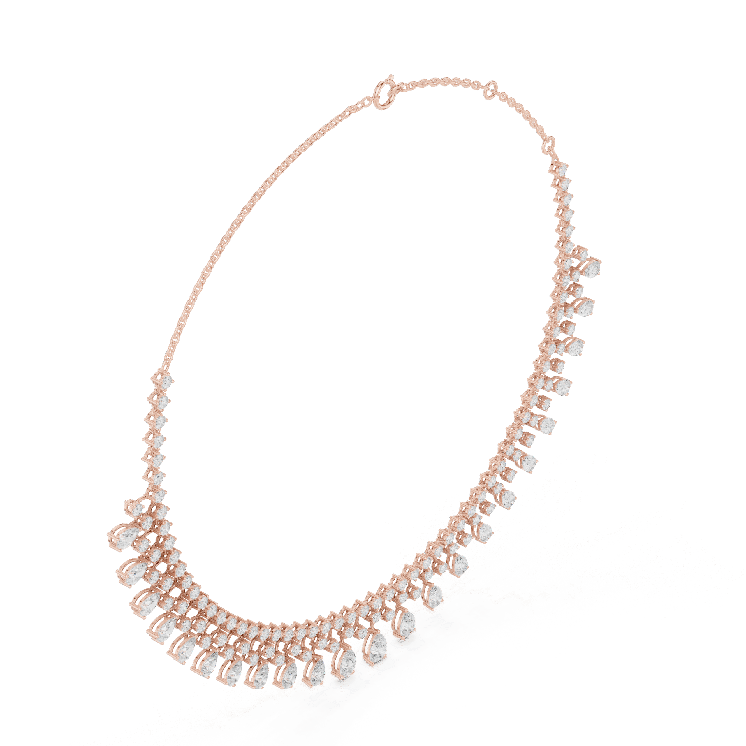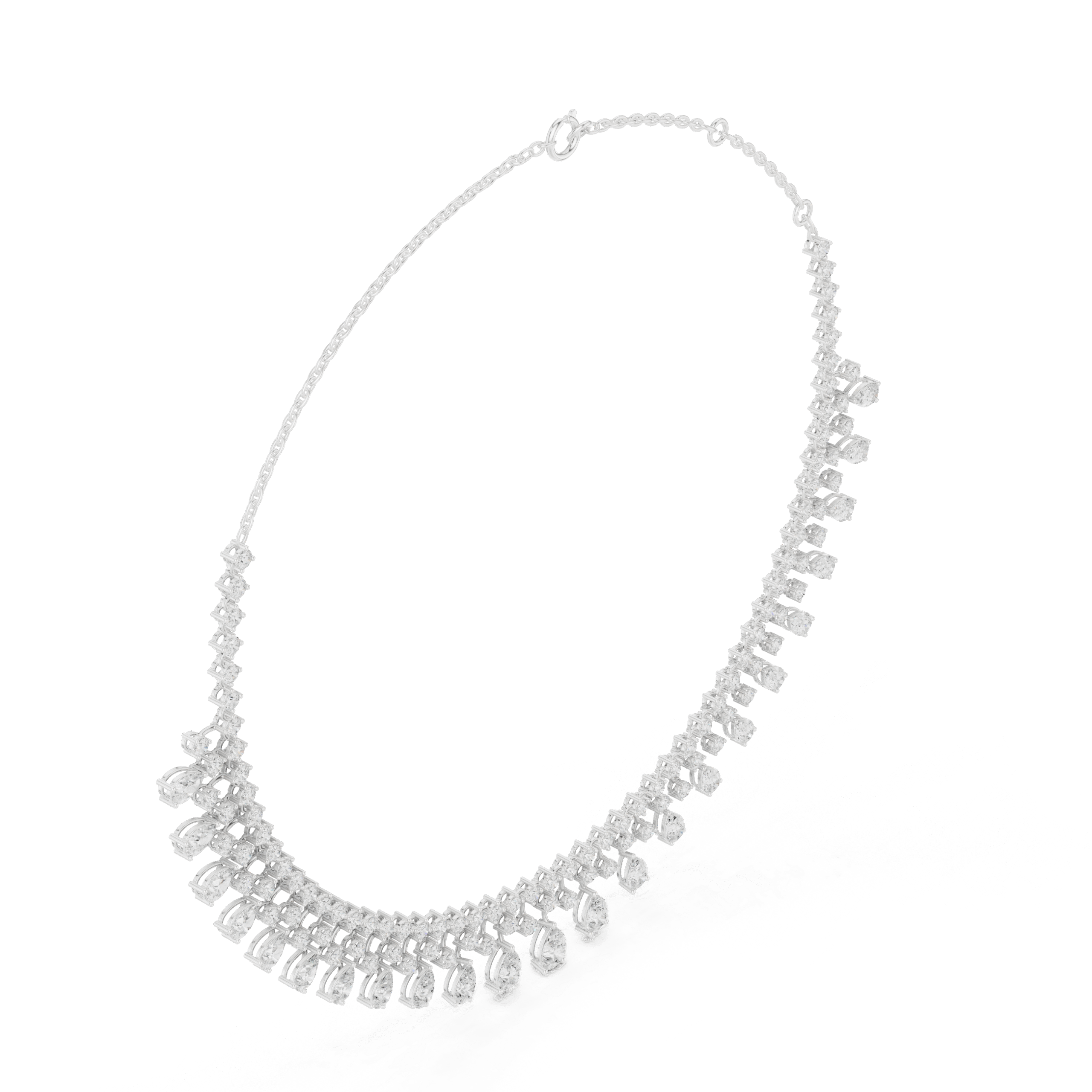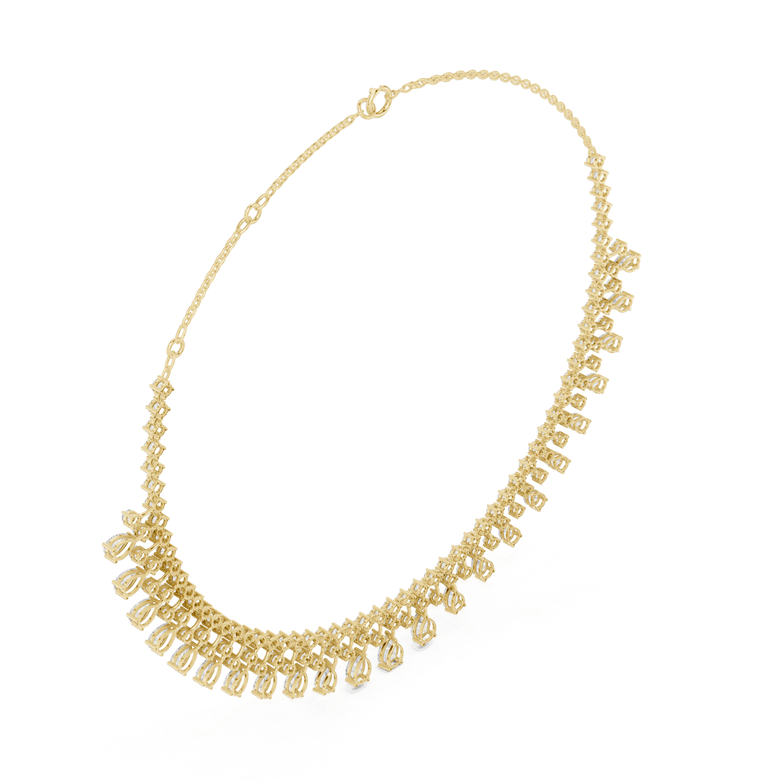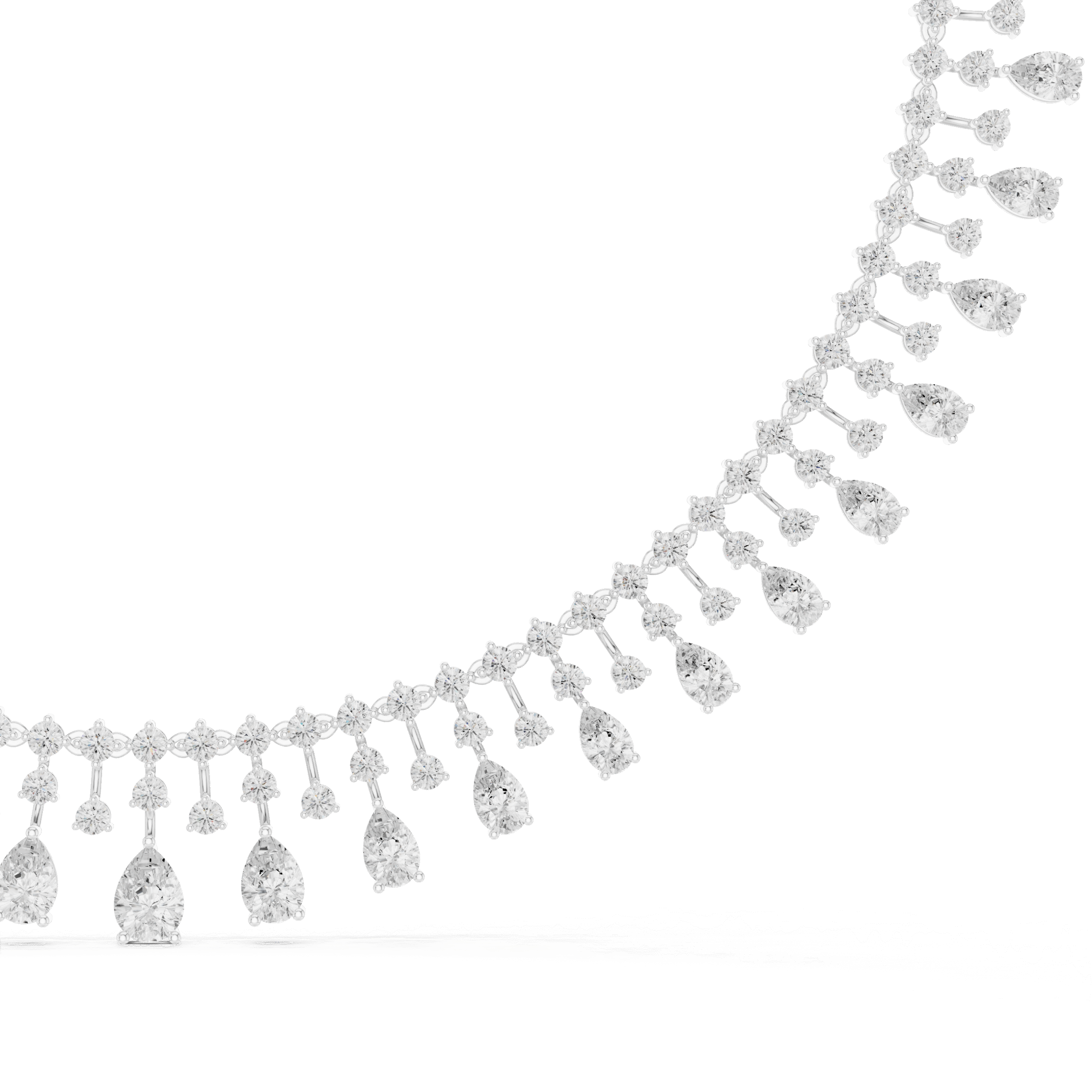 This Grand Cascade Pear-Drop Lab-Grown Diamond Necklace showcases a breathtaking fringe of graduated teardrop stones that create a luxurious waterfall effect along the neckline. Each pear-shaped diamond is suspended from a brilliant round-cut chain, meticulously arranged to increase in size toward the center for a regal, red-carpet focal point. Combining timeless opulence with modern craftsmanship, this high-jewelry statement piece offers unmatched radiance and fluid movement for the most unforgettable occasions.