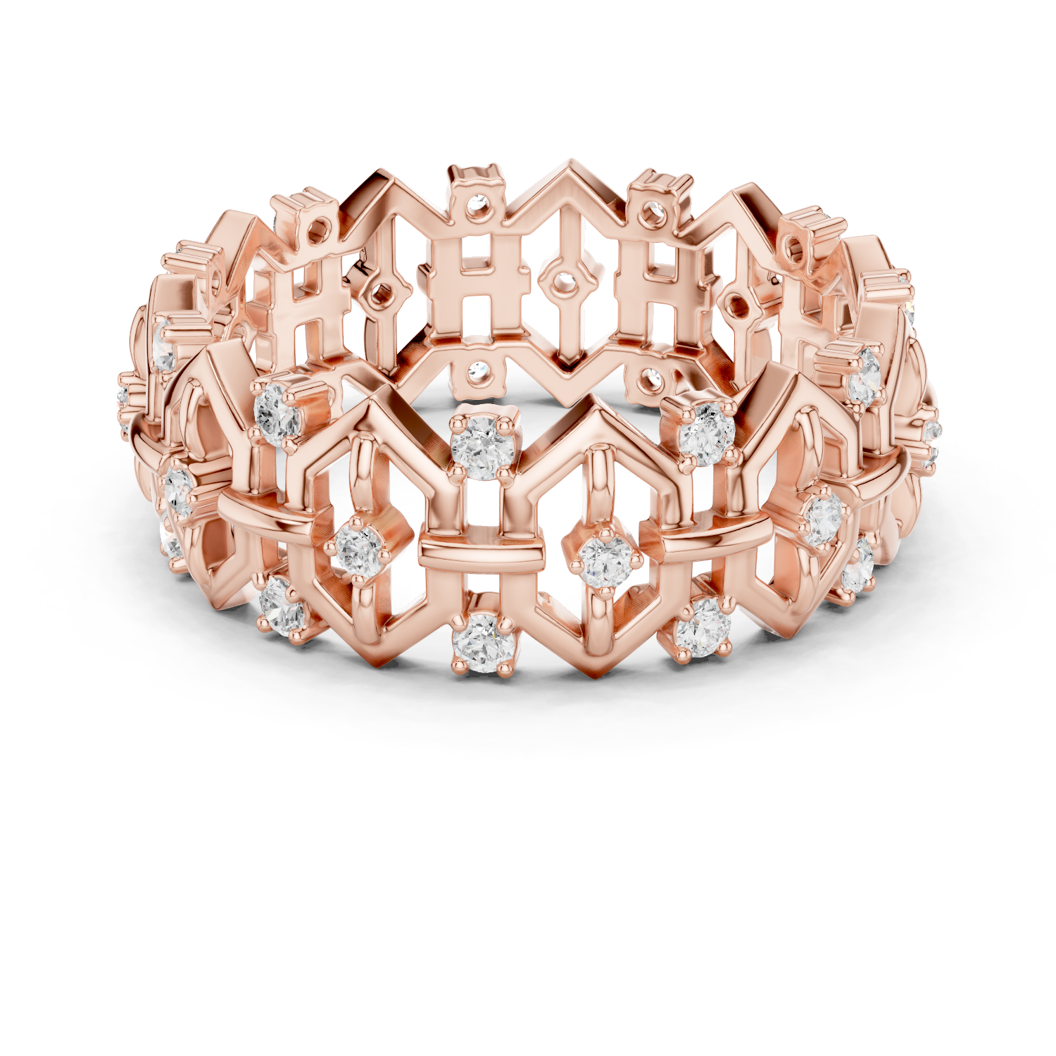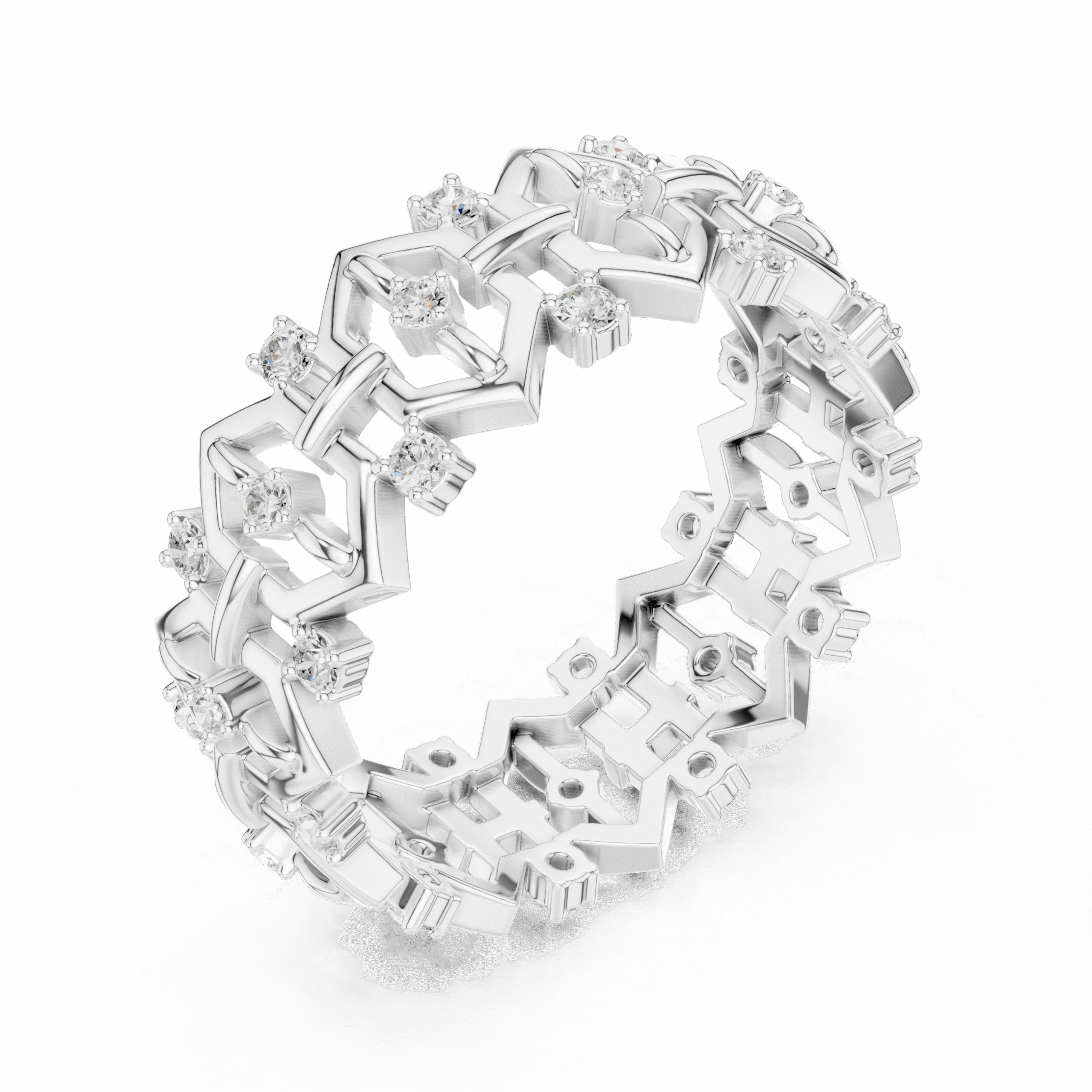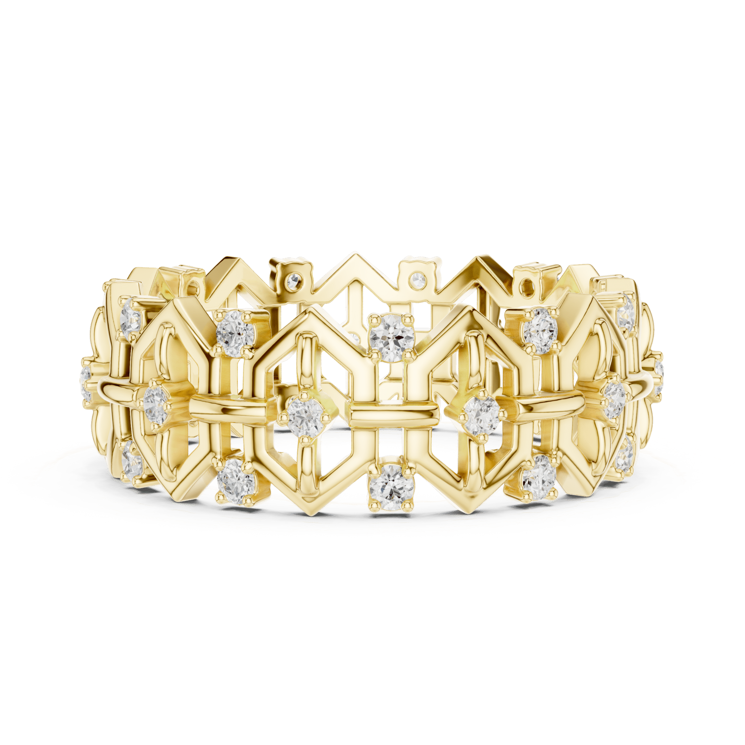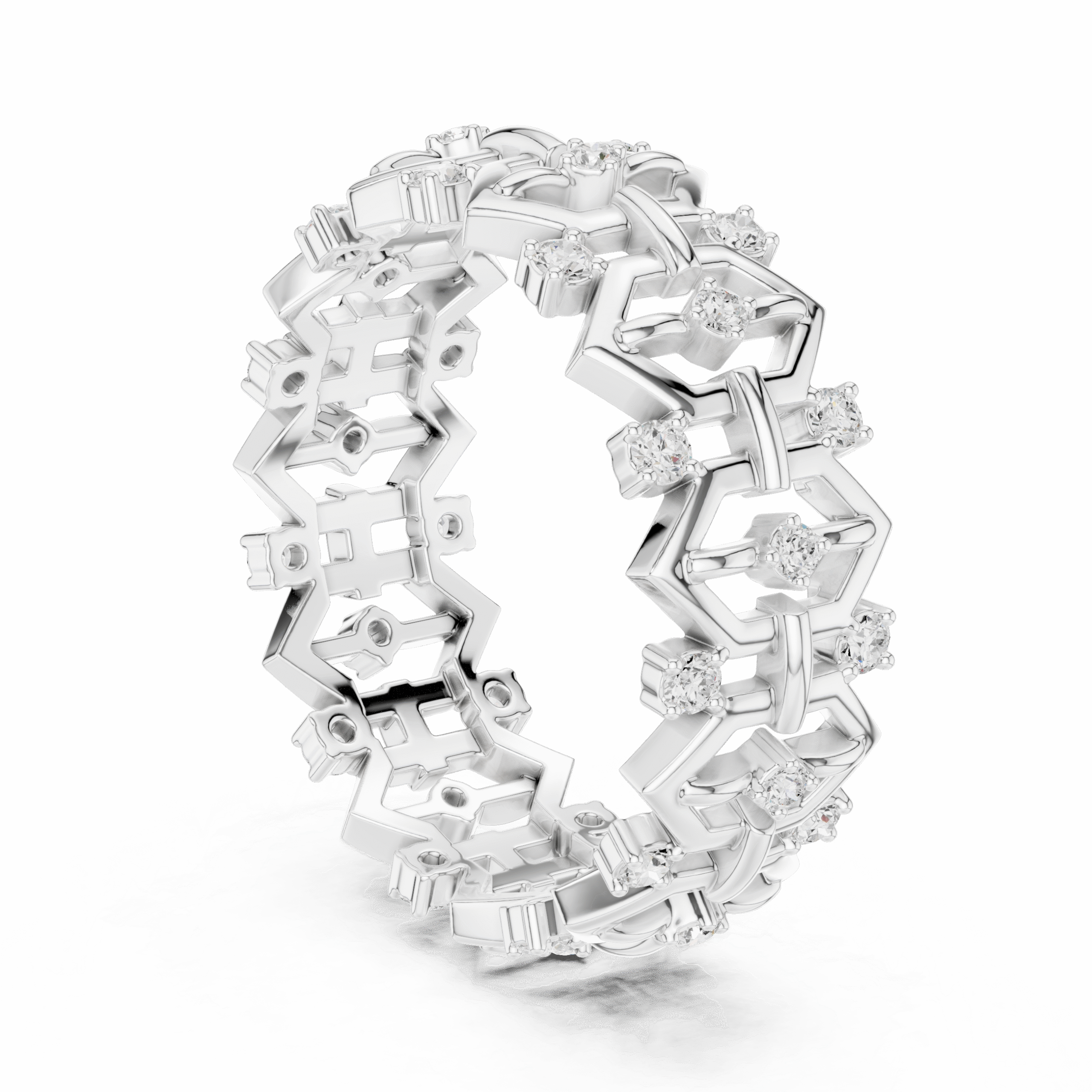 This Geometric Hexagonal Lab-Grown Diamond Statement Band features an intricate lattice design that creates a modern honeycomb-inspired silhouette around the finger. The architectural white gold framework is punctuated by brilliant round diamonds, strategically placed to catch the light from every angle of the open-work structure. Balancing bold industrial lines with refined sparkle, this wide-profile band offers a contemporary and sophisticated aesthetic perfect for those seeking a unique, fashion-forward jewelry piece.