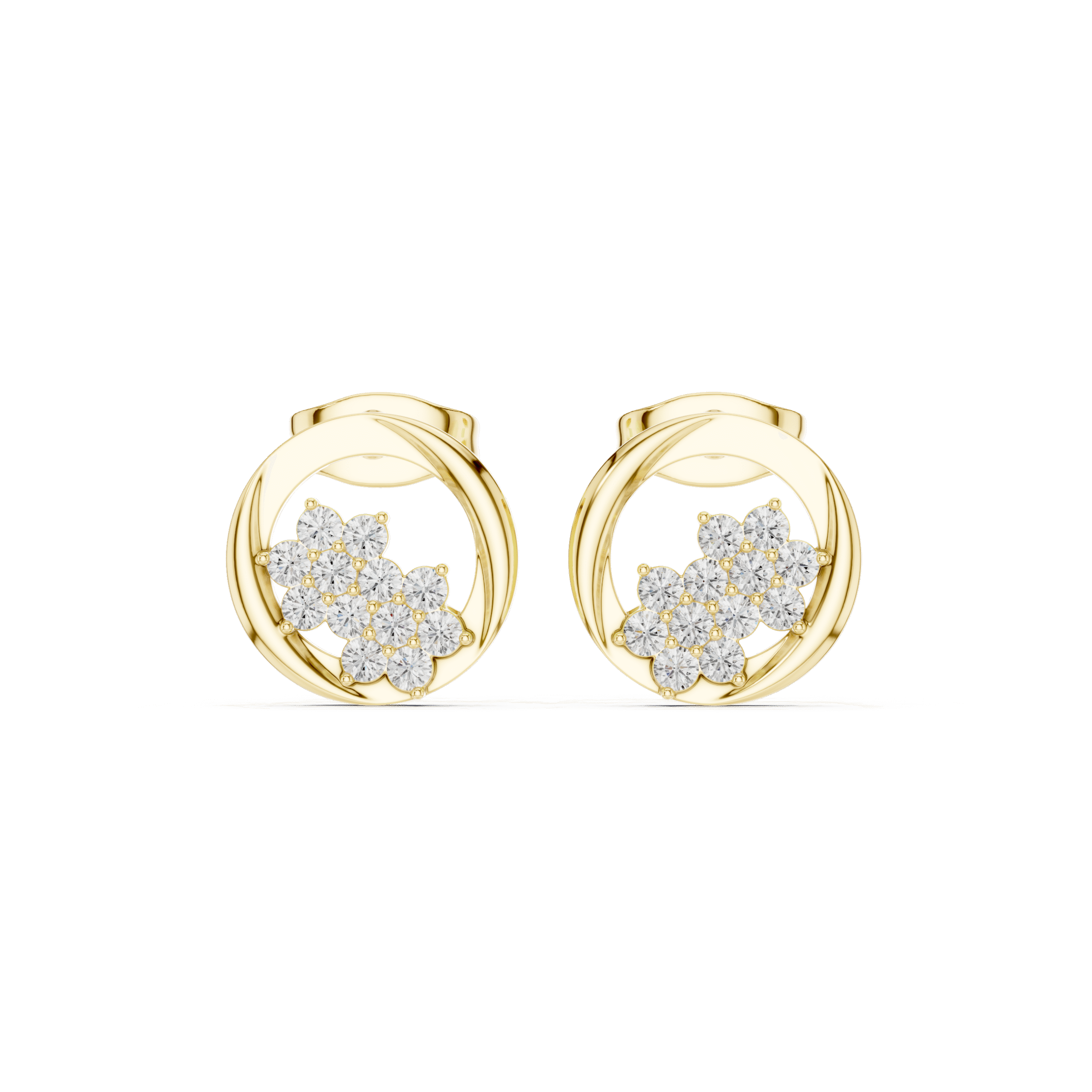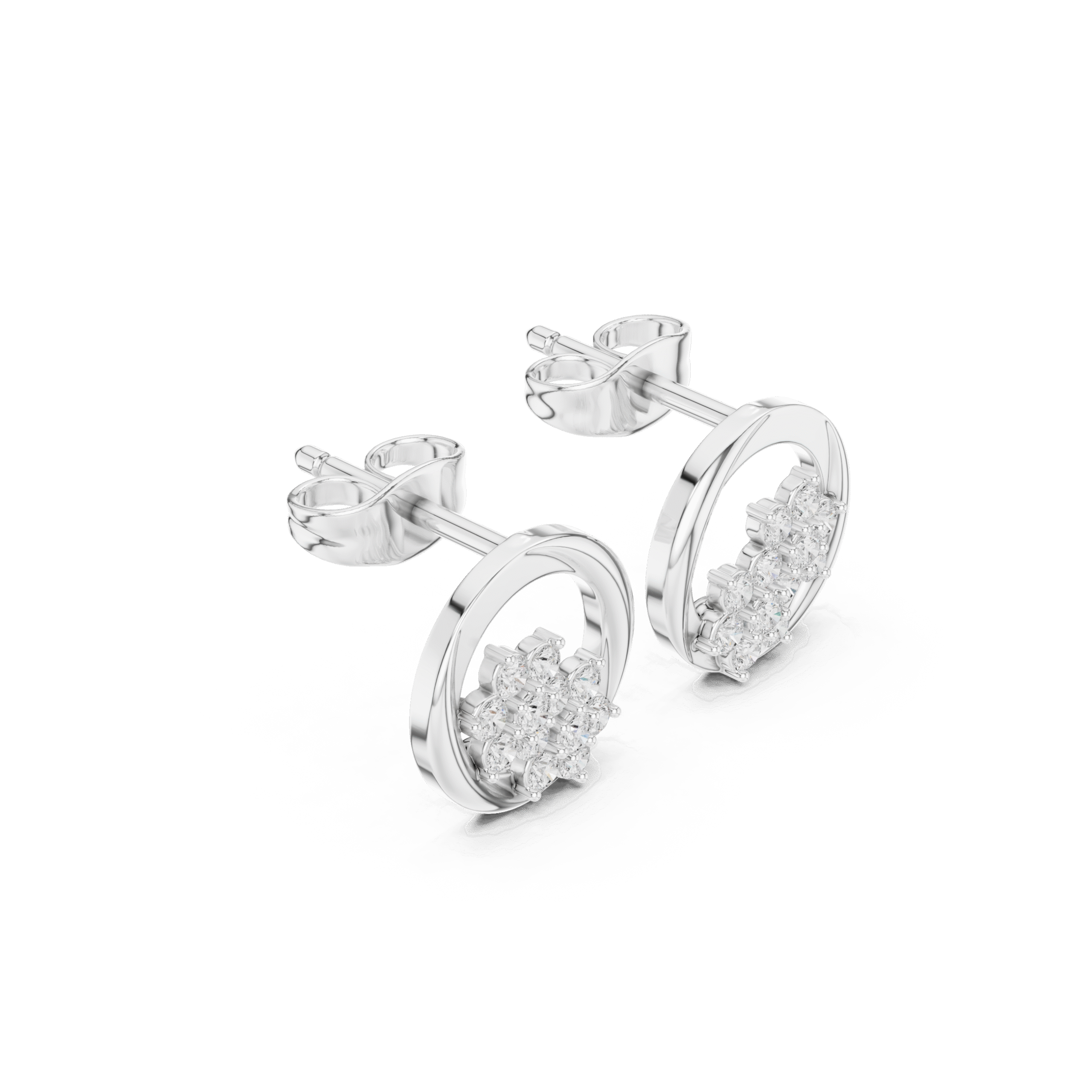 These Circular Blossom Lab-Grown Diamond Stud Earrings feature a unique open-frame design that elegantly encircles a pair of shimmering floral clusters. Each delicate blossom is meticulously crafted with brilliant round diamonds, appearing to float within the polished white gold orbit for a modern, ethereal look. Combining geometric precision with organic femininity, these sophisticated earrings offer a captivating sparkle that makes them a versatile choice for both elevated daily wear and special celebrations.